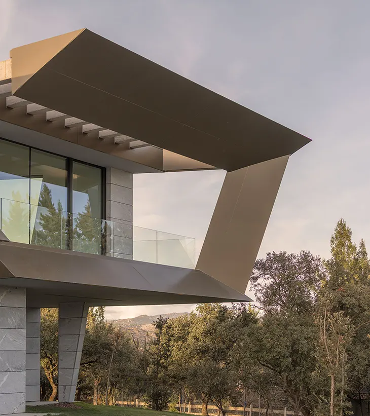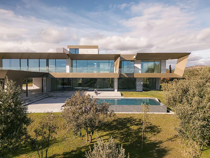Unode Estudio designs a folded residence that frames views of Madrid while integrating with the wooded terrain.