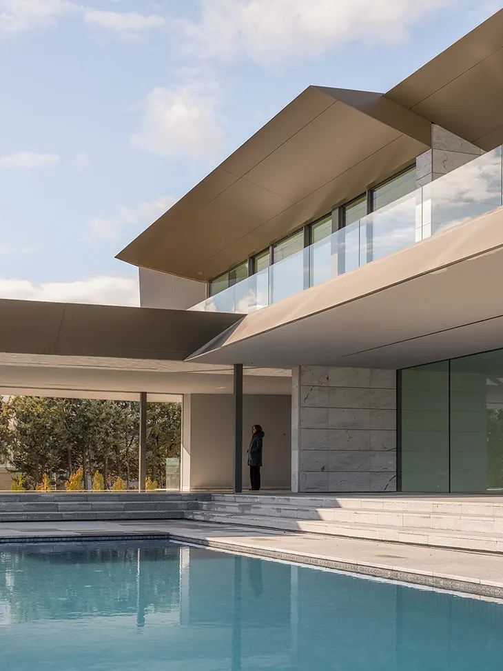 Unode Estudio developed the architecture as a folded volume that gradually opens toward the south. The façade is defined by a series of articulated folds that shape the geometry of the building while guiding interior movement. These folds also orient the main rooms toward the most favorable views and sunlight. Through this strategy, the building integrates environmental considerations directly into its formal language.