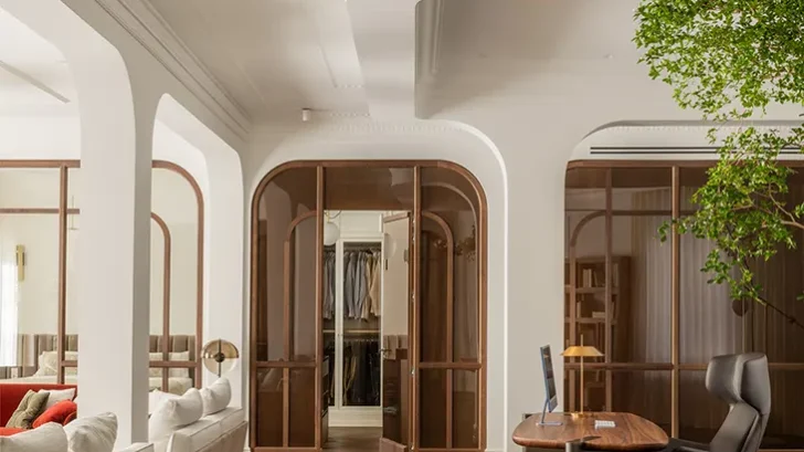 The property’s heritage protection status required that the original layout remain intact, a restriction that BAT Architecture turned into opportunity. Through a subtle system of arches, echoed across ceilings and thresholds, the architects created a spatial rhythm that recalls the original plan while freeing the perception of space. Light now guides movement through the residence, gently defining transitions between rooms while maintaining visual continuity.
