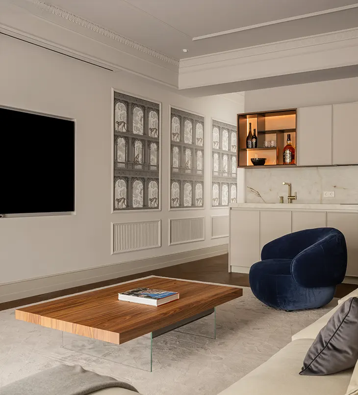 The apartment’s structure allows two distinct modes of living: one for daily use, encompassing living, dining, and master suite, and another for family gatherings, where additional bedrooms feature independent bathrooms. The residence concludes in a private cinema room with a backlit bar and wallpaper by Cole & Son, depicting neoclassical façades populated by whimsical creatures, a surreal nod to the building’s historic character.