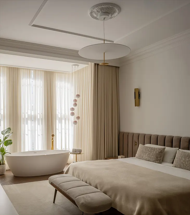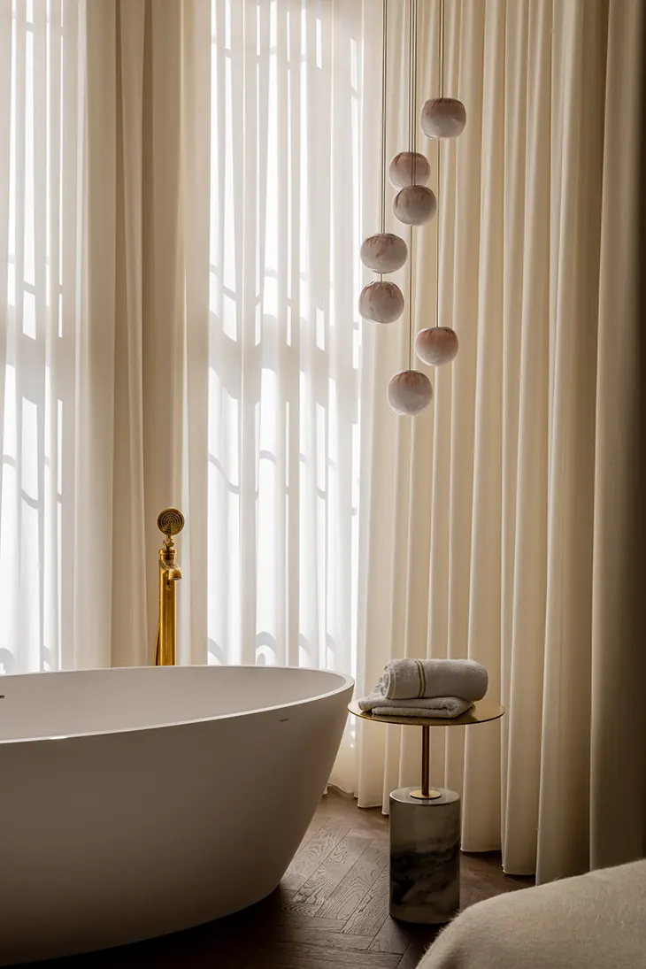 In the private quarters, the master suite adopts a softer tone. Sandy hues, an upholstered headboard, and a freestanding bathtub positioned before the windows create an atmosphere of quiet indulgence. The adjoining bathroom contrasts this calm with a monolithic marble block veined in gold and refined Steinberg fixtures.