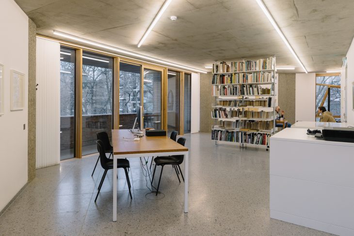 Trevor Horne Architects worked closely with the gallery directors and the artists with whom they work to incorporate their work into three elements of the building. Marc Camille Chaimowicz proposed the large oak window design, Lucy McKenzie produced the hand painted trompe l’oeil ceramic cladding to the balconies, and John Knight conceived the narrow ‘slot’ aperture between the park and gallery, based on the historic doors that artists would have cut into walls or floors through which to pass canvases.