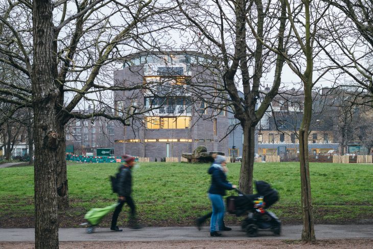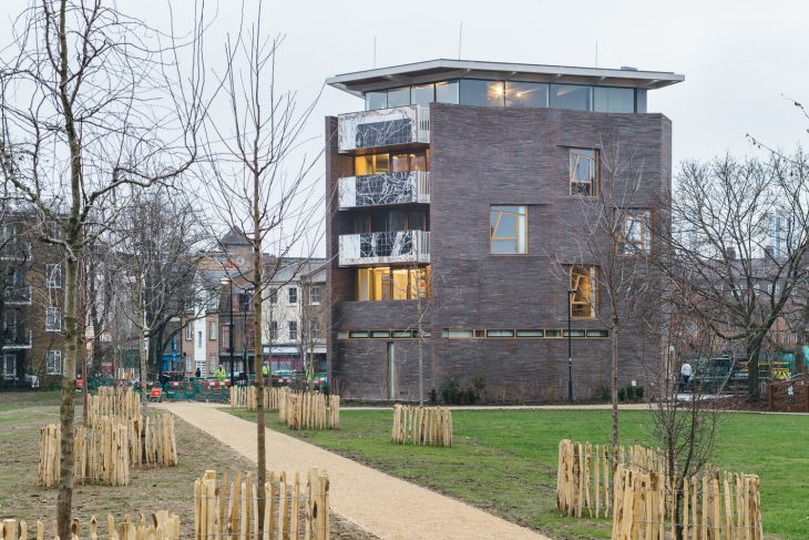 The practice, which has previously worked with such galleries as Victoria Miro and PEER, worked collaboratively with Charles Asprey and the gallery directors, plus a number of their artists to develop the design. The brief was for a bespoke gallery that would reflect the iconoclastic and international reputation of Cabinet. The result is a five storey brick building marking an entrance to the park with a twelve-sided gallery that determined the overall form of the building – exhibition and office space on the lower levels, a fully glazed events space on top with flats between, the flats helping finance the project.