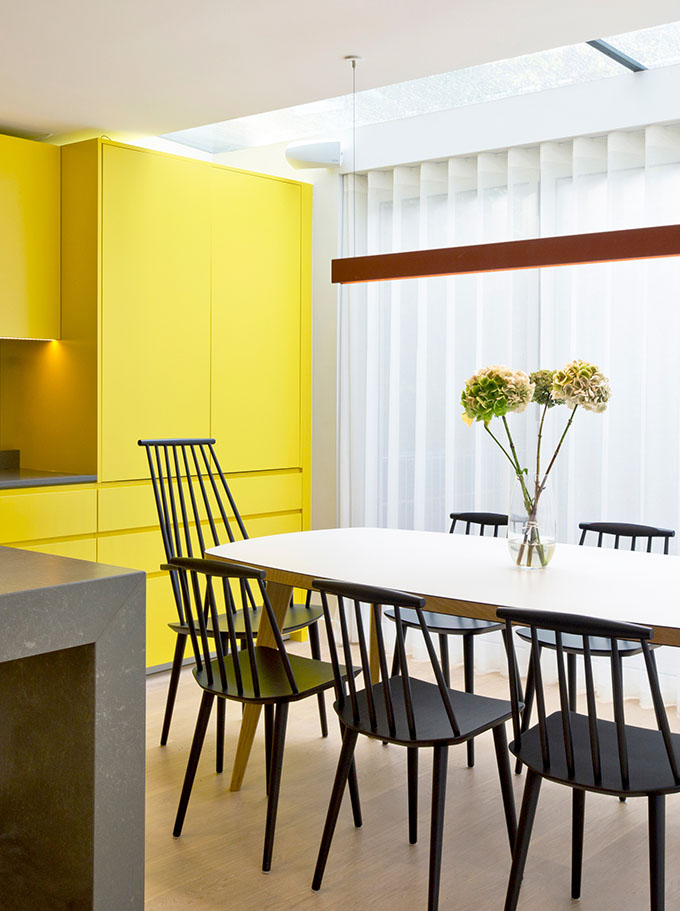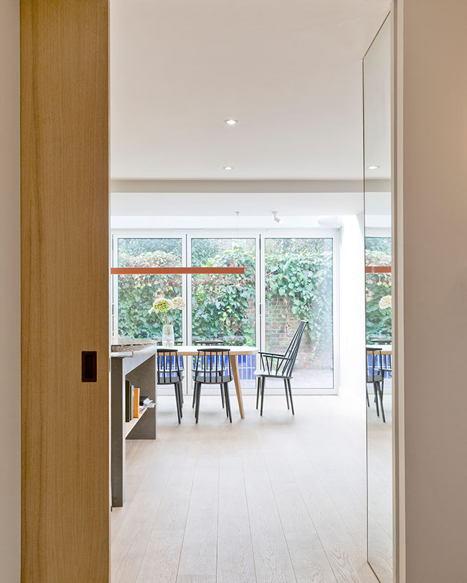 At first floor, a flexible space can be separated with sliding doors to create a study, play room and a formal reception room overlooking the garden. The study is located in the original shiplap timber clad bay, that cantilevers over the main entrance. The client drove the principle of colour that ran through the scheme’s interior design, inspired by Richard Roger’s house in Wimbledon built in the same year as this property.