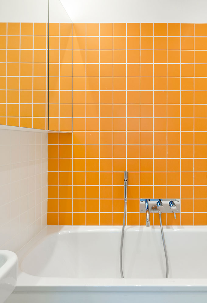 The rear extension at ground floor creates a new kitchen and social space with dual aspect views of the surrounding garden. White oiled oak flooring creates a clean contemporary finish to the space, while reflecting light deep into the room. Dark blue ceramic tiles in the garden draw inspiration from the original tiles at the entrance to each house. Bold colour highlights continue in the kitchen units, new stair and the geometric tiled bathroom.