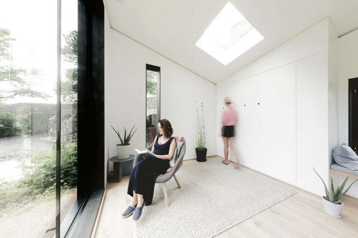 Throughout the buildings, expansive concealed storage walls maximise floor space and maintain the clean aesthetic. The space is flooded by natural light, cosy nooks and generous bespoke window seats, maximising use of space whilst connecting the user to the outside world. Although working with a relatively small footprint, the tall diagonal ridge opens up the spaces dramatically.