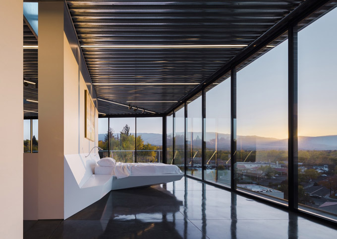 From the architects: Two art collectors and dealers specializing in contemporary art and art of the American West decided to move from the arid high desert outside of Reno to a less remote site overlooking the city. They wanted a house that would both reflect the contemporary moment and be explicit of the West. The new site, a large lot located on a bluff in an established neighborhood, gazes off at the desert mountains in the distance, but otherwise offered little other inspiration. We joined the site in gazing off at the bare mountains and decided to think about the desert as a real environment as well as its ambivalent role in the cultural imaginary.
