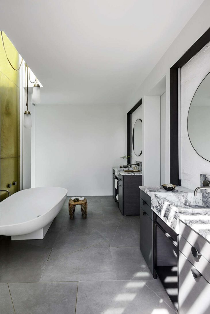 A unique feature is slab-on-grade construction, selected to promote indoor-outdoor living by locating interior and exterior spaces at the same level. A double-height great room with a window wall amplifies the connection to the outdoors, which includes a dining patio, BBQ, and fireplace lounge framed by a steel pergola with oculus.