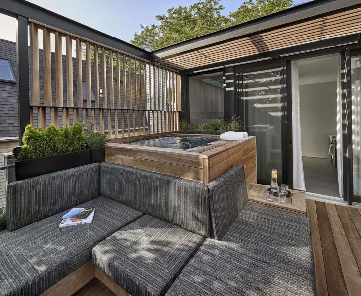The rear elevation is defined by beveled portals and deep overhangs, offering passive solar shading and heating and focused views toward the city skyline. Oversized sliding doors provide an abundance of fresh air.