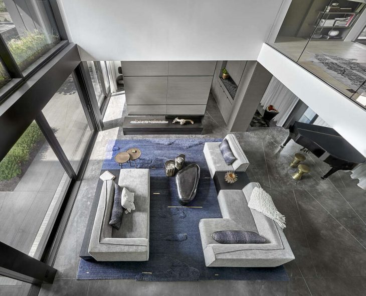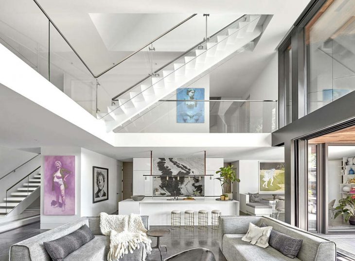Indoors, a switchback staircase with floating treads and glass guardrails is designed so the landscape becomes integral to the experience of circulating through the home. A steel ribbon staircase, suspended over the great room, leads to the master suite which has a two-sided fireplace opening to a roof terrace with a spa overlooking the city.
