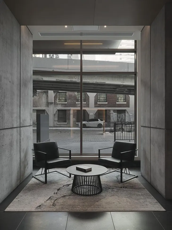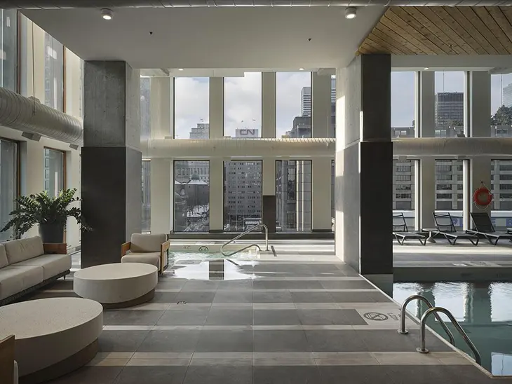 The tower’s defining gesture lies in its mineral envelope. While many contemporary residential towers rely on curtain wall glazing, 900 Saint-Jacques adopts sculpted precast concrete panels that reference Montreal’s architectural lineage. The façade recalls the material grain of Old Montreal, Place Ville-Marie, the Sun Life Building, and the Olympic Park. Through this lineage, the project asserts a contemporary identity rooted in local material culture.