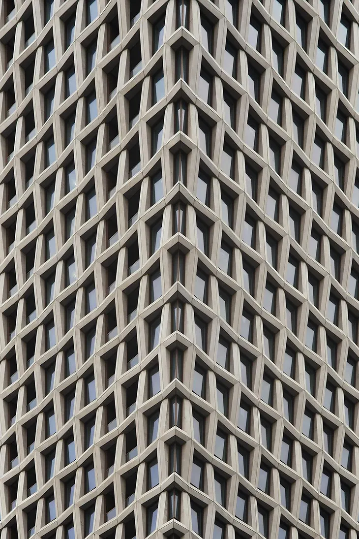 The façade system relies on repetition and recomposition of a limited set of prefabricated modules. False joints, open corner panels, and geometries that extend beyond module limits dissolve the perception of segmentation, creating a continuous surface with a textile-like depth. Solar exposure animates the relief, revealing subtle shifts across the surface throughout the day. Transparent volumes punctuate the mass, exposing shared interiors and reinforcing the building’s connection to the public realm.