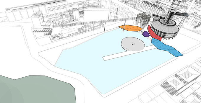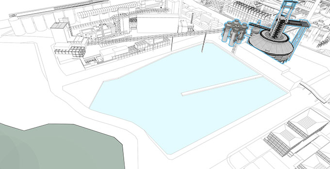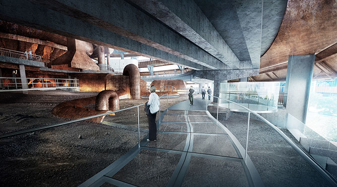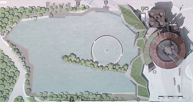 In the design, a parking lot is implanted at the bottom of the ancillary cooling pool of the blast furnace. In this way, it solves the general parking difficulty with industry remains. Through the underwater art exhibition hall placed together with it, people may dip into the lake to interpret the hundred year history of Shougang, to interact with the artwork in the exhibition hall, and also to have air dialogue with No.3 blast furnaces standing afar.