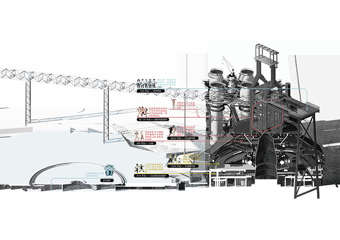 A large amount of the original artistic space of the blast furnace is rendered into urban exhibition hall. The four service platforms with different elevation within the furnace awning and the original cast house platform work as the core space experience site, providing shocking industry remains experience. On the other hand, the six service platforms out of the awning furnish sufficient interaction space between human and nature, generating urban activities never appeared in this piece of land. Functions, such as over sky bar, show stage, new products release, science education, social interaction and cultural stage emerge in the air. The high-altitude platform required by the process presents strong multi-dimensional stereo city meaning. Diversified urban behaviors interweave with the original architecture organically through multiple routes. As a result, industrialization eventually transforms into urbanism.