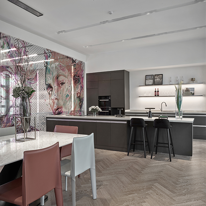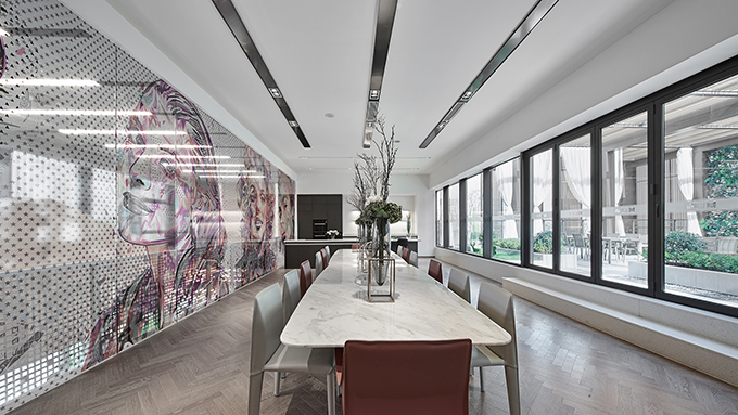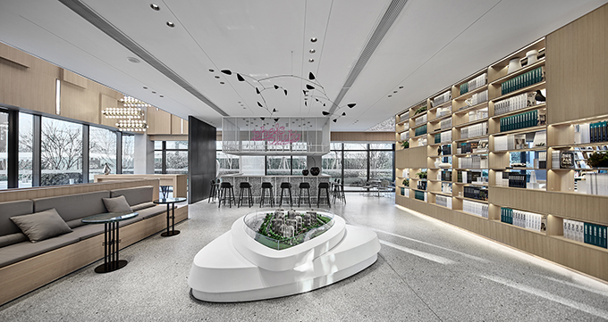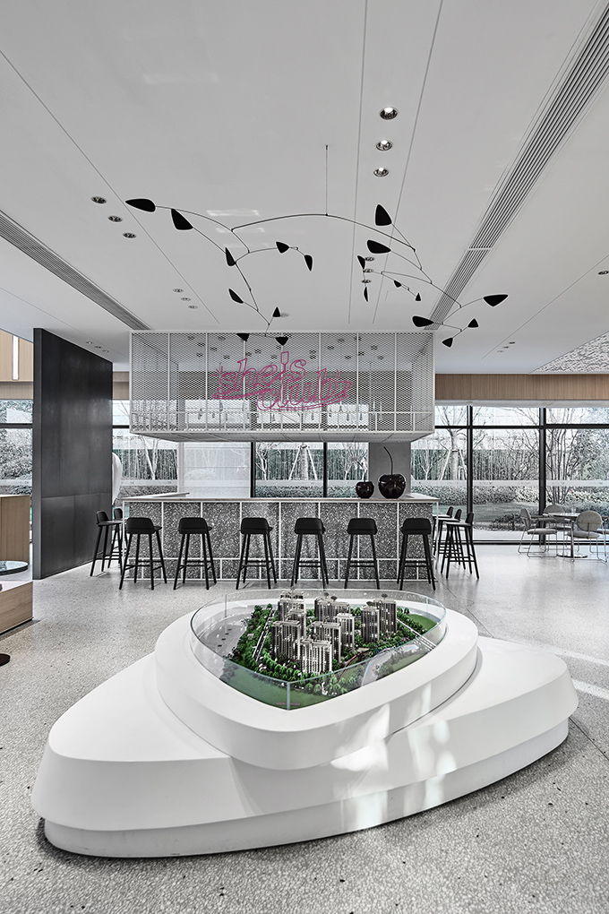 The Scandinavian-style furniture in the bar counter area was purchased from the Danish brand MUUTO, refreshing and unique, which resonates with the droplet pedant lamps. Behind the bar counter is an irregular-shaped area for displaying property models. The dynamic sculpture designed by ALEXANDER CALDER above it adds a sense of flexibility to the space.