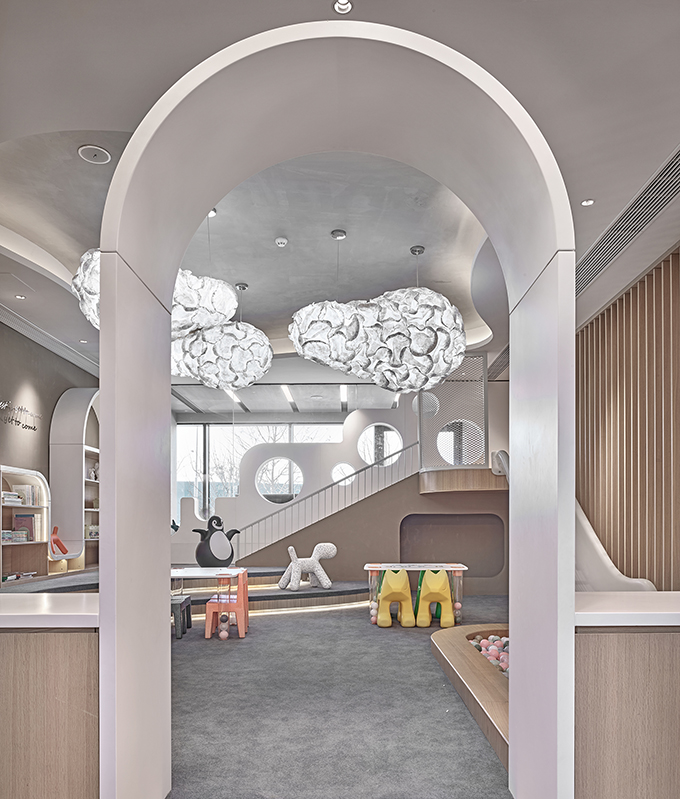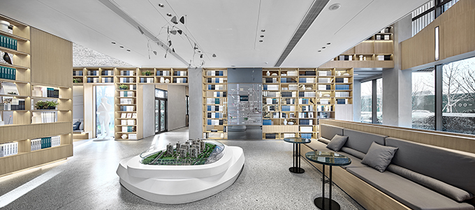 The children’s entertainment zone is beside the property model display area, where kids can learn things through lively and delightful activities. The arc-shaped bookshelf, furniture from the Italian furniture brand ME TOO, combined with Legos, make the space interesting and visually attracting.