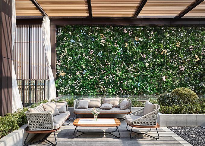 As arriving at the second floor, an open kitchen leaps to the eyes first. The long kitchen island helps housewives to bake and communicate freely, which facilitates interactions and ensures a lively atmosphere within the space. The visually striking graffiti on the translucent wall depicts a contemporary female with clean lines, which highlights the theme of the space and well coordinates with the flowers near it. Outside the kitchen is a pleasing garden, which presents a vibrant scene. This semi-open space is edged with a canopy for a canopy and gauze curtains. An outdoor sofa set is placed in front of a wall with flowers and grasses, which enables people to enjoy afternoon tea and chat with friends in an elegant and refreshing environment.