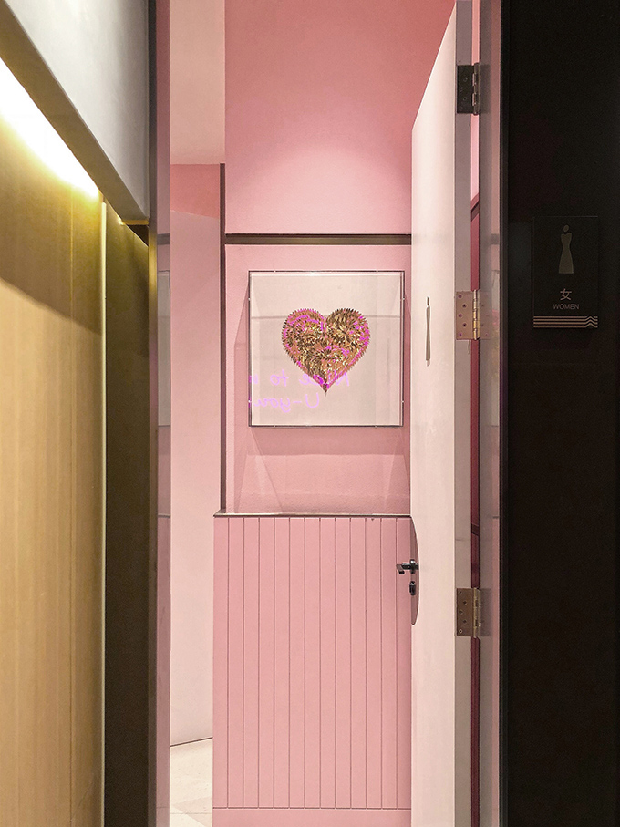 The design team adopted different color palettes in the men’s washroom and women’s washroom. A large area of pink produces a lovely atmosphere in the women’s washroom and makeup room, and neon lamps on the wall add individuality and avant-garde stylishness to the space. In contrast, the men’s washroom is characterized by turquoise color, in which the painting of geometric shapes enriches the sense of structure in the space. Besides, TOM DIXON toiletries placed in the washrooms can serve for people’s pursuit of a quality life.