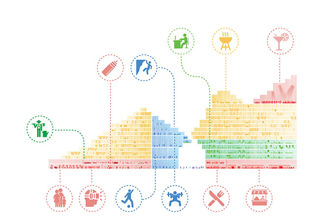 The builgind is comprised of 17.000 sqm of housing – including 5000 sqm of social housing -, and of 5.300 sqm of office space. About 6.000 sqm of convivial use program are spread out on the groundfloor and rooftop. A food-court, a daycare center, a family office, community centers, an escape game, a rooftop bar, and a sport hub comprised of a climbing walls, urban soccer and paddel pitches, and a gym.