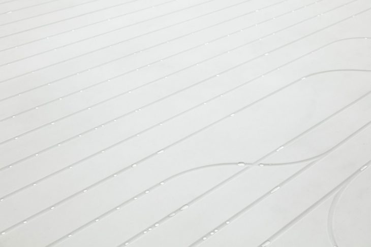 At the opening on 9 February 2018, visitors will be able to enter the pavilion through a dark corridor that opens into a bright white space lined with solid-surface material Corian. Channels have been carved into its surface as part of a multi-sensory hydrophobic water installation also designed by Khan. Walking across a pathway, visitors interact with sensors causing 25,000 water droplets a minute to whizz along the channels, colliding and splitting before pooling into a lake.