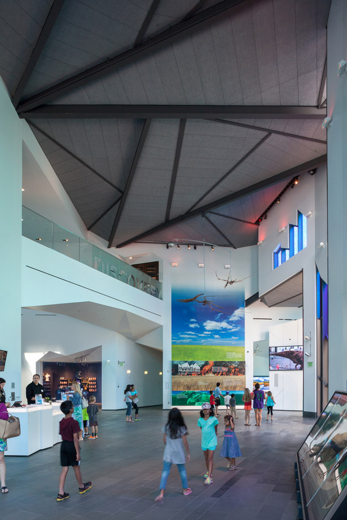 The project’s LEED Silver Certification attests to its environmentally sound design and construction practices, echoing the architectural concept rooted in sustainability – the preservation of the tallgrass prairie ecosystem. The Museum was designed as a civic hub featuring world-class traveling exhibits from the American Museum of Natural History. By engaging the local population in broader cultural and scientific experiences, while architecturally celebrating the rich story of the region, the Museum grounds it within a larger context and forges an identity for the suburb.