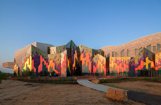 The design boldly contrasts with the surroundings but touches the sensibilities of the locality by orchestrating distinctive materials, forms, and technologies to produce a new and provocative regionalism. To overcome the challenge of enticing visitors during down times between traveling shows, the building itself becomes an exhibit. The colorful and sculptural design reinterprets regional stone practices, celebrating the natural stratification of the local fossilized limestone. Color-shifting LIC (Light Interference Color) stainless steel panels are designed in a gradient from blue to gold, echoing flame bursts and sparks.