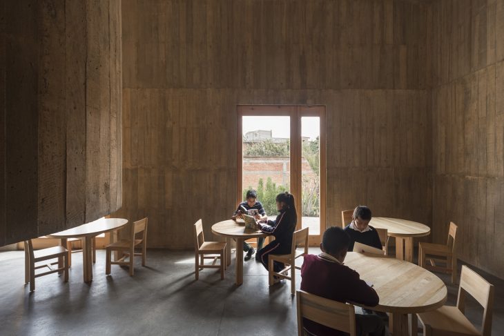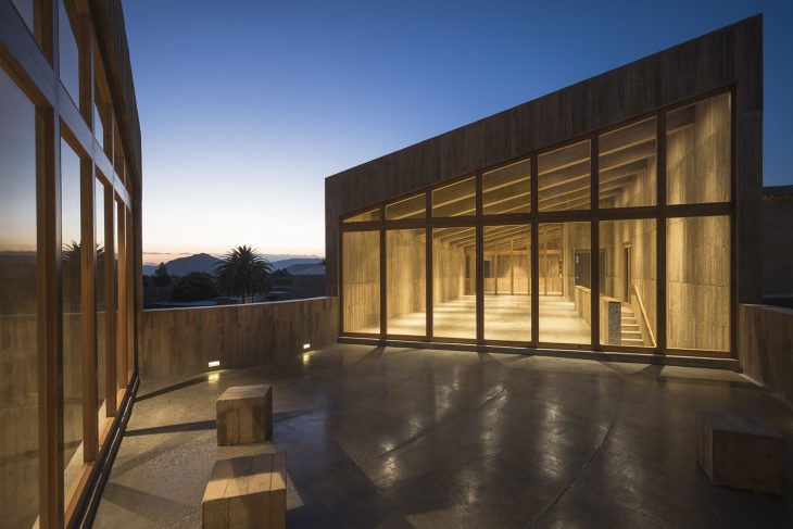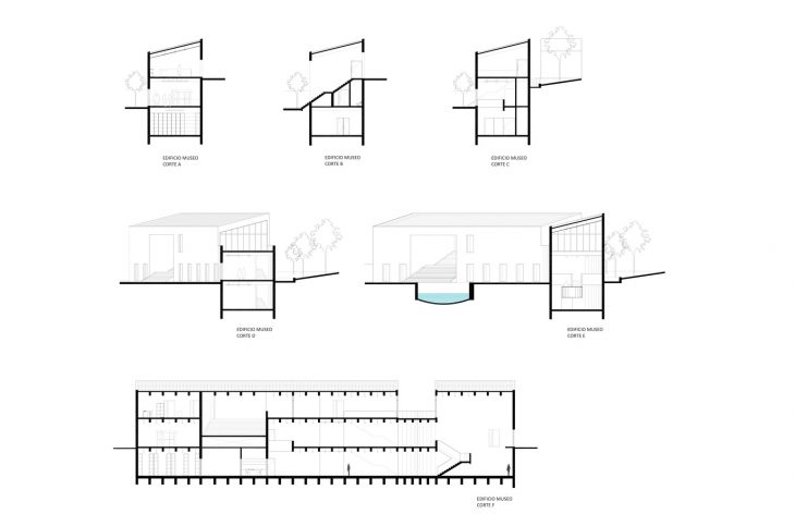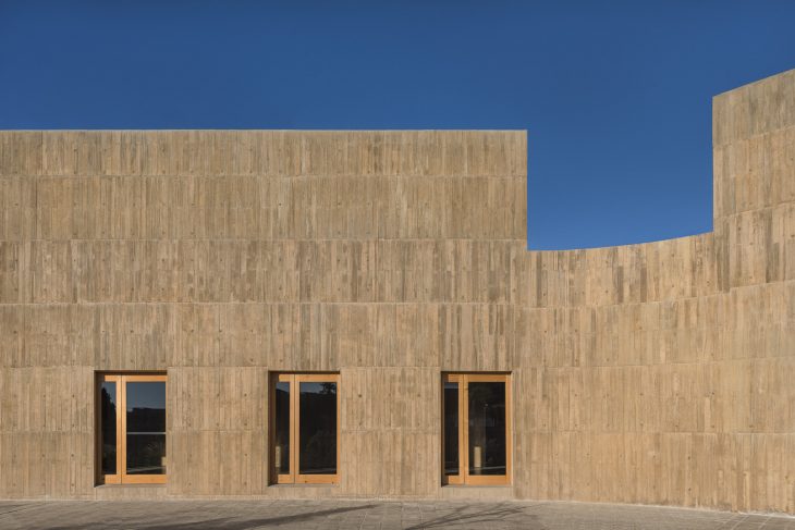 The architectural volumes present austere, neutral façades. The form and material character of the building, including double-slab sloping roofs, 30 cm-thick concrete walls, and controlled openings, create a passive system that responds to the adverse climatic conditions. This basic strategy helps to regulate the temperature inside the building and provides users with a comfortable space to read a book, work or visit the museum, and at the same time eliminates the need to install air conditioning systems. The interiors present a diverse range of lighting conditions and spatial qualities (double and triple-height spaces), generating different atmospheres for exhibitions and activities. The Cultural Center uses a minimal palette of locally made materials (pigmented concrete, timber, clay tiles and bricks) in order to blend into its context.