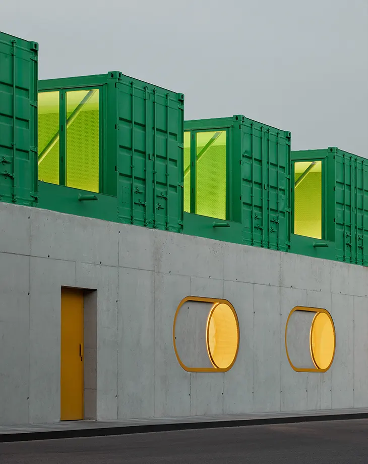 The spatial structure of the building follows a clear and repeatable system. Four reused shipping containers, opened along two sides, rest on a concrete plinth shared with the surrounding industrial buildings. Their arrangement forms a saw-tooth roof profile that operates as a sequence of skylights. This configuration introduces consistent daylight deep into the interior while creating a controlled lighting environment suited to office work and laboratory activity. The north-facing orientation of the roof openings ensures stable and diffused natural light throughout the day.