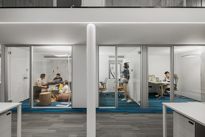 With a view to creating an open-plan office area, the design team set both independent work spaces and shared work spaces, so that the staff can choose the way of working in accordance with their preferences. Such design helps to facilitate face-to-face communication and professional knowledge exchanges among the staff, improve their capability of adapting to changing environment and strengthen their impetus for work, hence enhancing work efficiency. As for seating, the designers chose Steelcase ergonomic office chairs which make the employees feel comfortable and energetic. For lighting design in each independent offices, the interior and lighting designers made a new attempt. As opposed to installing lighting fixtures on the ceiling, they determined to use Waldmann free-standing luminaires. Such solution not only gives the ceiling a simple and clean look but also ensures the light to be soft and pleasant. The average color temperature of light is 4000k, creating a bright and pleasant working environment. However, in the shared working area, which was not partitioned by the floor slab, the designers adopted a different lighting solution. Considering that it was a full-height space, desk lamps were utilized so as to guarantee sufficient light. Besides, on the ceiling of this area, wide-angle track projectors were installed. In order to protect the staff at each seat from dazzling light, the designers made some multilayer cellular reticulations to cover these projectors.