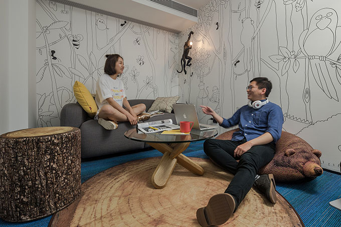With the theme of “forest”, the design of the brainstorm area is unique and distinctive. In order to bring the forest into the space and recall childlike innocence, designers put a stump-shaped chair, a rug with pattern of tree rings, a sofa resembling sleeping bear and a wall lamp in the shape of monkey in the area. Such bold and ingenuous combination of these elements is conductive to encouraging the staff to “think out of the box” and spark inspiration and creativity during team discussions. As for lighting design, designers chose to utilize floor lamps instead of point light sources, which generate soft and undazzling light, making people feel comfortable and cozy.