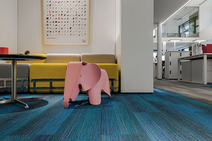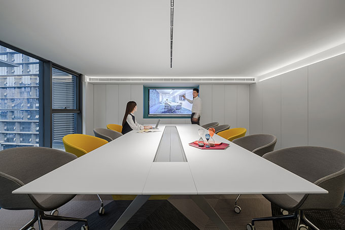 For the conference room, the designers fully utilized neutral tones, with a view to optimizing visual experience. Besides, to improve the efficiency of meetings, a Four Point Eight board-room table was placed in it. There is a rectangular groove in the center of the table so that all power suppliers and data cables can be installed in it, thus avoiding mess in the space. All the lights are focused on the table. Moreover, a smart flat-panel TV was installed on the wall, which offers a new and convenient way for the staff to make presentations and enables them to write on the screen, indicating a future conference mode. The Bolon carpet and HAY furniture with vibrant colors keep tediousness off during meetings. With upward illuminants lightening the ceiling, it makes the space relaxing, though with limited height.