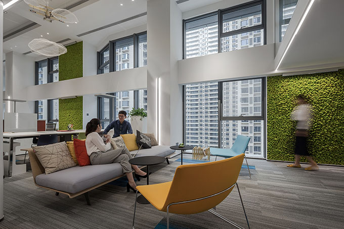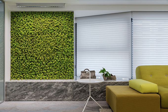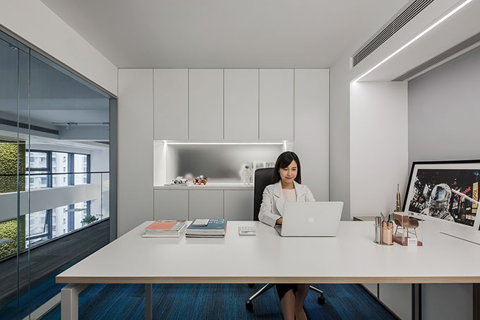 In the CEO’s office, the designers put a fish-scale-patterned carpet on the floor, with its streamlines interplaying with light strips, presenting a soft and relaxing tone. Besides, the green plant wall, combined with the sunlight that penetrates the Hunter Douglas louver, inject vigor and vitality into the space.