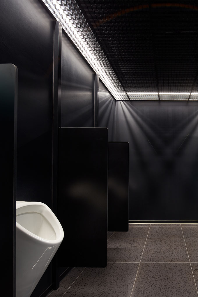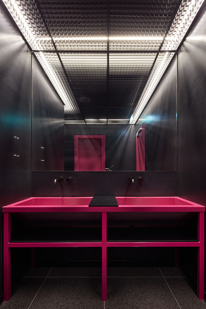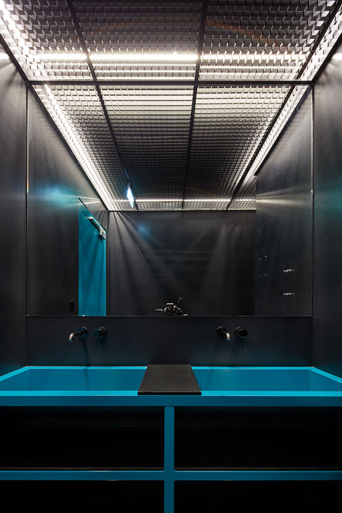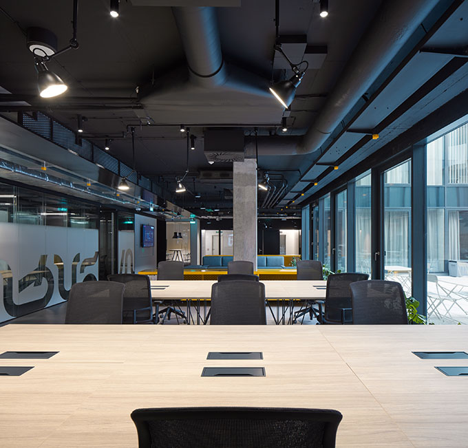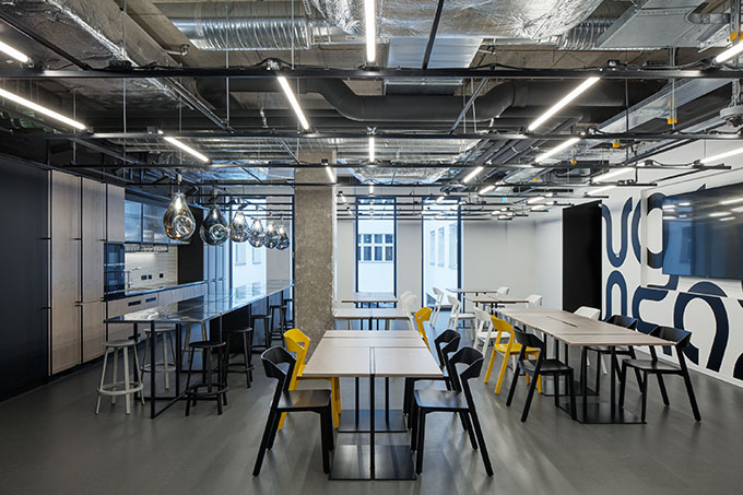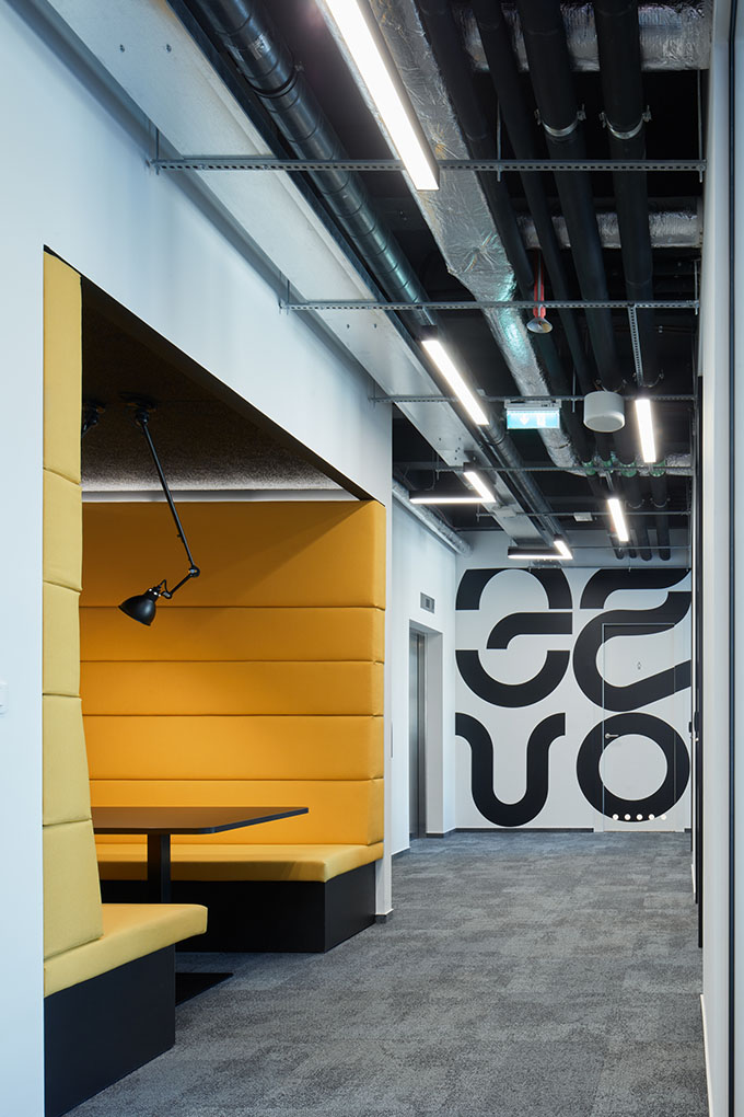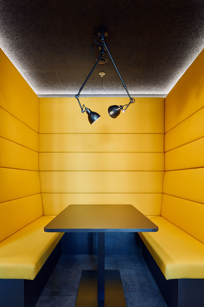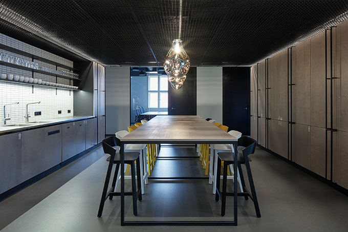 The chosen aesthetics of a “twenty first century digital workshop” unfolds from the level of sustainability required. It’s not only the design that counts, all the elements have to be able to endure a lot in the first place. Expressive metal furniture on the raised podium is, along with the yellow reception desk, designed to withstand the flow of people comparable to that in important public institutions. Kitchen tops and bars are made of stainless steel, which is yet to fully reveal its unique beauty through the everyday wear and tear.
