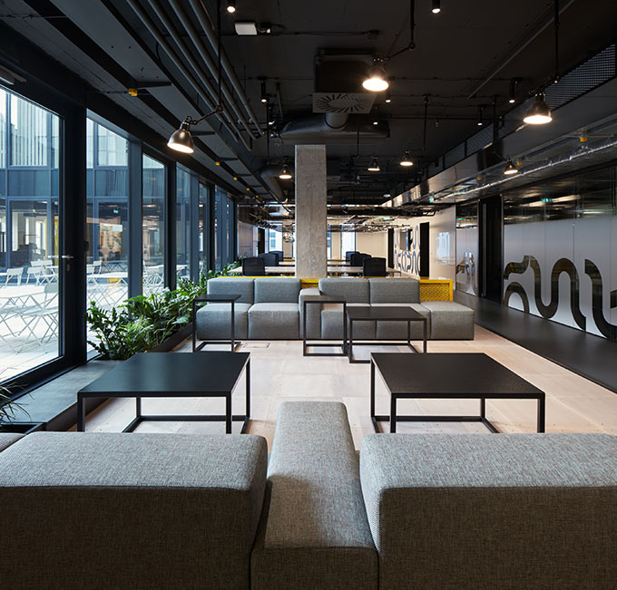 The moment you enter, you know where to go. A bold, daring reception desk made of yellow expanded metal is impossible to overlook. You see many different working areas, you immediately know what meeting rooms are free, you notice where the community kitchen is, you feel the buzz coming out of the event space.