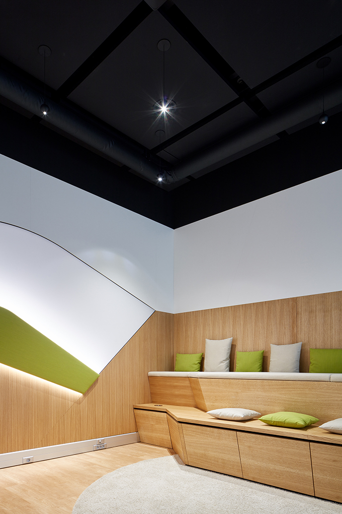 The design concept for INNO-SPACE U20 is based on the contemporary shapes and makes of the ŠKODA AUTO electric car’s headlights. High quality materials and finishes are used as a reflection of the company’s tradition. Natural materials (e.g. oak panelling) bring a more humane and homey atmosphere into the mix. The combination of design, materials and equipment promotes a playful and alternative approach to well-established processes.