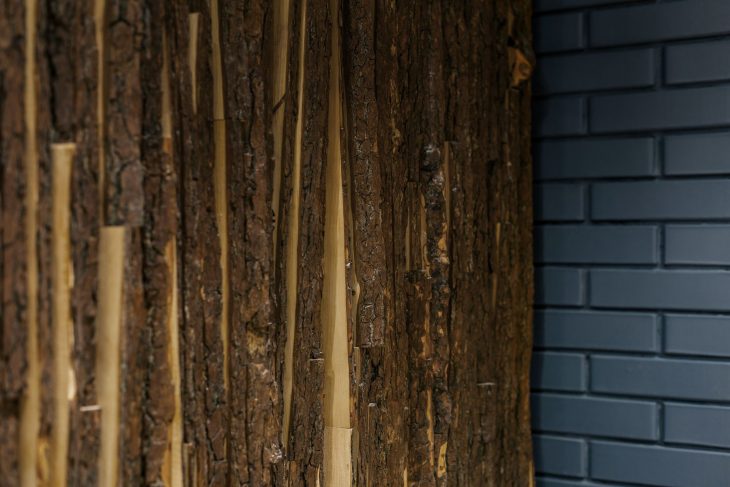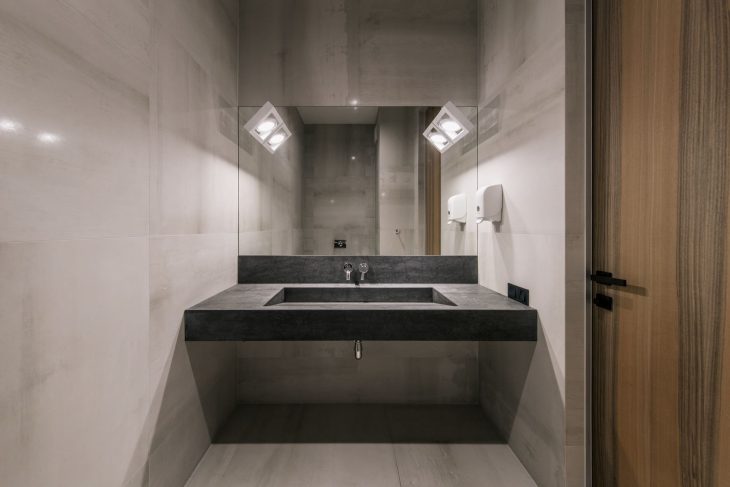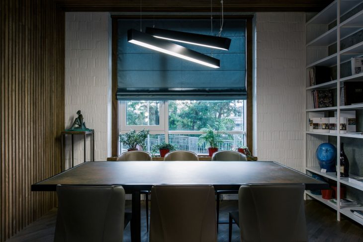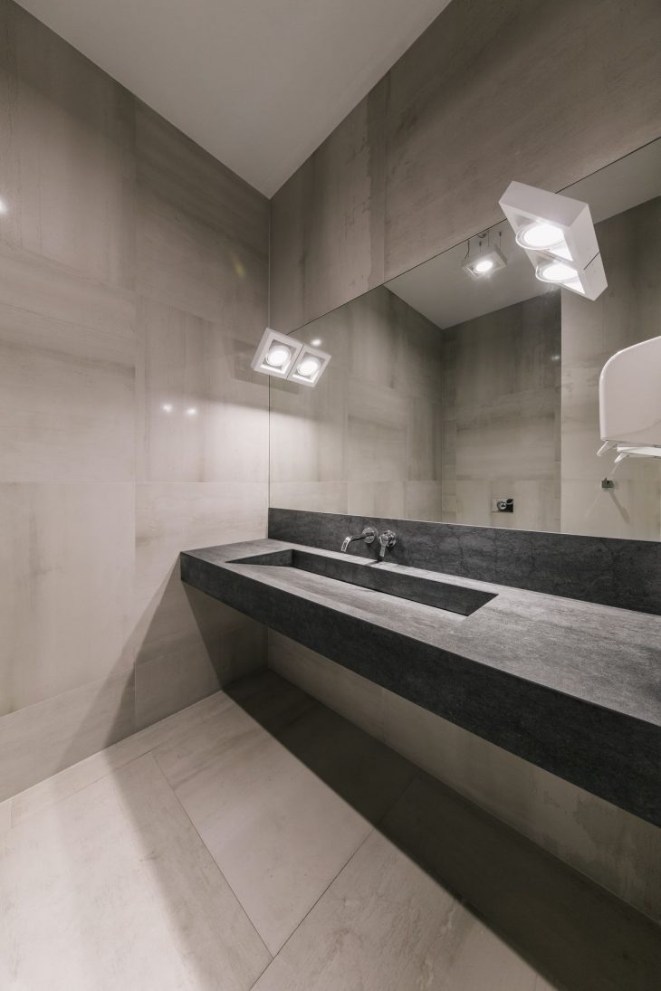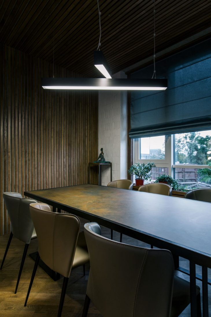 The area for negotiations also includes modern metallic shelves for press and interior mood boards. We used a lot of textures: raw concrete, natural wood, metal, glass, greenery and copper. You can see the large tile of the Spanish factory “Apavisa” with the effect of metal erosion, the Italian “Laminam” stone for a slit meter sink and the “Ferrerolegno” door 2.8 m high. For the inspiration of the guests we paid special attention to novelties in lighting. We love local manufacturers but no one can touch with global brands. Pendant light “Copernico” by Artemide, floor lamps “Twiggy” by Foscarini, trendy LED luminaires “Cork” by Wever&Ducre, famous pendant lam “OK” by Flos, table lamp “Anisha” by Foscarini and another table lamp “Volee” by Fontana Arte. On the terrace you can see outdoor floor lamp “Inout” by Metalarte.