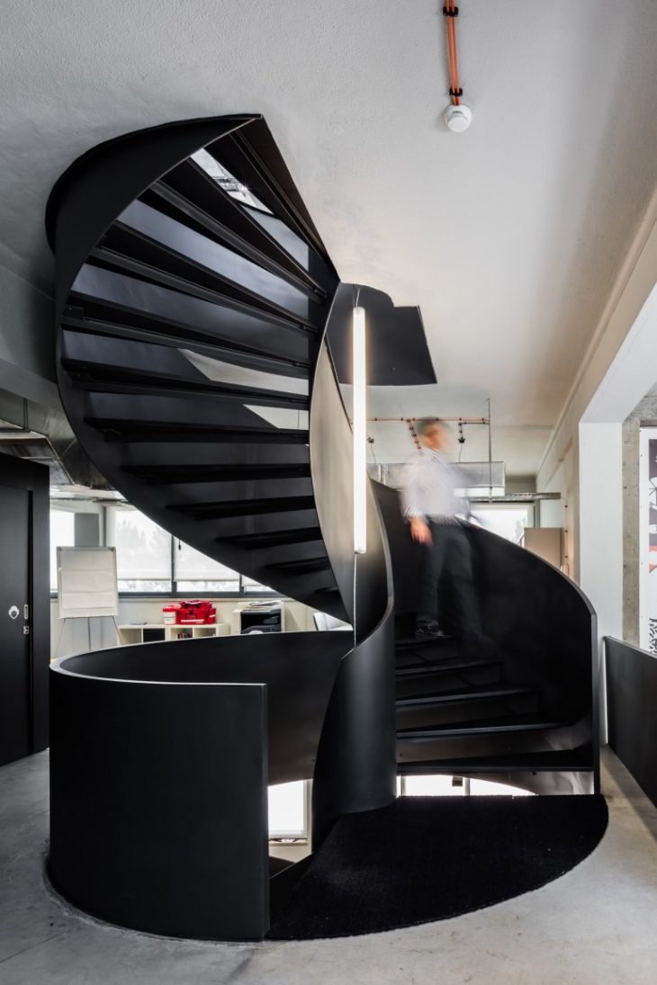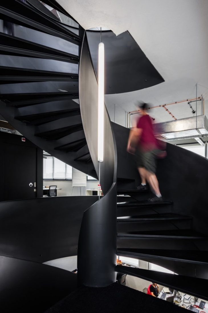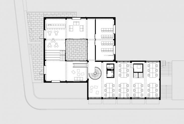 From the atchitects: The challenge was established by the Proença-a-Nova Municipality. With a low budget investment create the new Office for Outsystems in Proença-a Nova aligned with the in house entrepreneurial culture. The focus was centered in the spaces character of light, construction materials and volume and by the use of the structure metrics to create a robust frame for the proposed concept of a interior patio. The Ytong bloc was a 2 in 1 solution providing the required comfort levels as well an expressive finishing solution for the interior and exterior image. The infrastructures that supports the firms operation (electric, mechanic and network) were used as an expressive element in the space character and program organization. To a 3 floors existing building we add a new volume that helds the social areas that supports the daily life of Outsystems. The informal spaces are very important in the groups dynamics of the firm. They are tools in the creative process. The patio is the central point of the scene supported by the spiral staircase (the shape is inspired by the firm’s logo) that connects the standard work spaces with the social area. The plan of the addition organize around the patio the cafeteria, informal auditorium and training room. The entrance was set over the main road, Av Brasil. The path to the work areas forces the cross of the social areas in order to motivate the team building efforts.