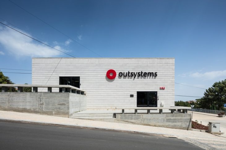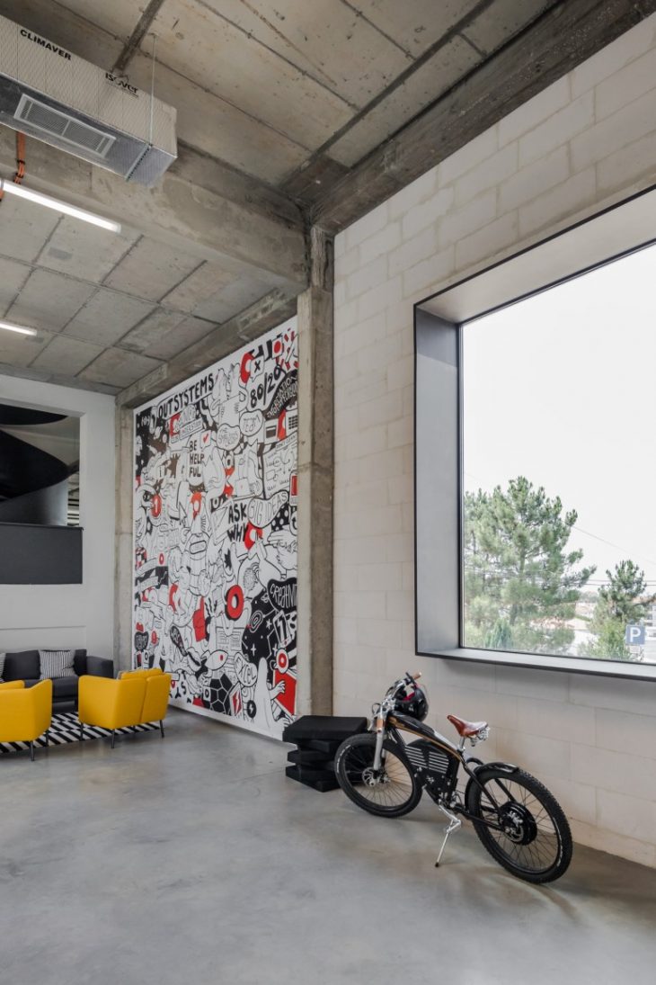 The single material texture of the façades (Ytong block), over the surrounding streets, was worked with and small incision on the horizontal joint of the single block in order to create a deeper vibration on solar incidence. The interior aims to connect with the corporative image of Outsystems as well generate an character for this office. The materials, colors and furniture were decide in coherence with the brand guidelines. The teams and employees were challenged to contribute in the space process. The slide idea was an internal suggestion that the firm has welcomed in the office. The Artist Vanessa Teodoro was invited to develop a graphic wall based in the values and culture of Outsystems.