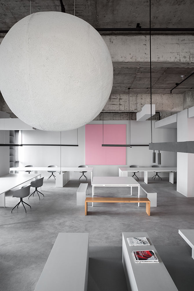 A square box constitutes the main framework of the workspace. In the conversation area, the designer integrated semi-circle structures and a ball hung from the ceiling into the single spatial block, resulting in intersection of different boundaries. Not restricted to a certain rule, all the elements in the space can form various combinations. When these interesting and diversified elements collide with each other, the originally ordinary space becomes unique.