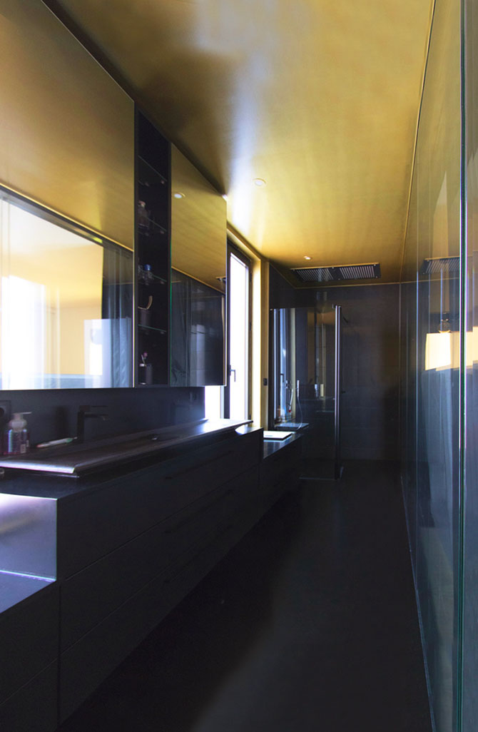 The north façade overlooking the street is covered with black limewash ; on this side, there is spaces which don’t require permanent heating or solar input. Made with very few openings, this facade is treated with custom shade systems and shutters to preserve the in-house privacy.