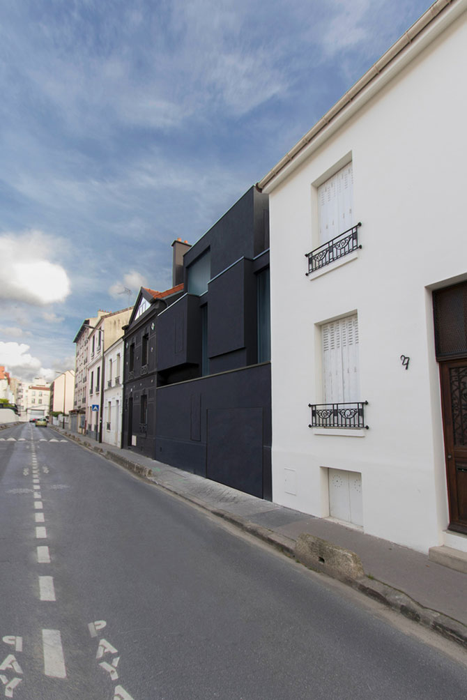From the architects: Located in Boulogne Billancourt (district 92), on Paris’s western area, 3Box92 is a 2 floor vertical extension constructed on an 19th century existing building.Entirely built with prefabricated systems, the room units are stacked one to another, creating mass superpositions, voids and double heights.