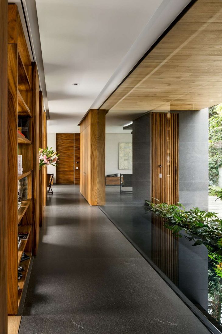 The connection between the spaces is generated through a hallway, flanked by the terrace and a reflecting pond and by an adaptable double-sided bookshelf, that connects the study and the garden. The visual axis is a sliding lattice that allows the space to transform, playing with the privacy of each space.