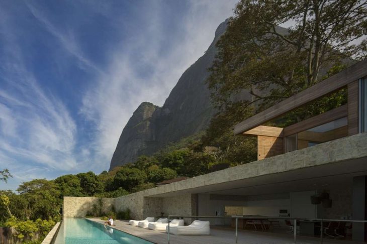 The infinity pool is a separate volume, a necessary space that transits in between architecture and landscape, in front of the balcony limited by delicate metal railings that seem to disappear among the horizontal lines of the house. If the house frames the sea from within, it is framed by the mountain and forests behind, standing in contrast against the monumental scale of Gavea Rock and the constant movement of hang gliders.
