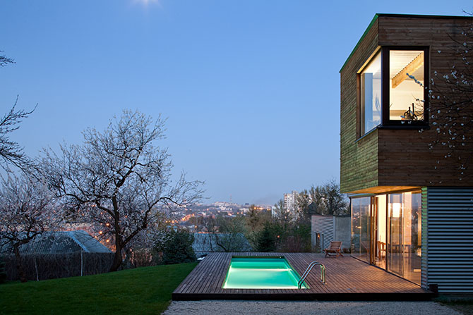 The wooden deck with an elongated swimming pool unites the cubit volumes into a common system.