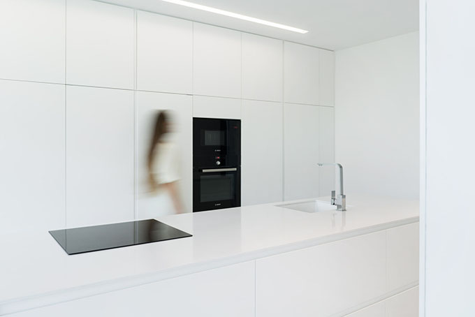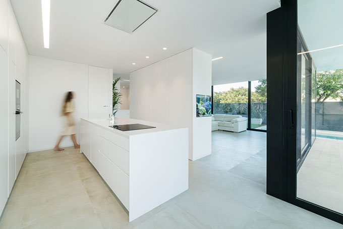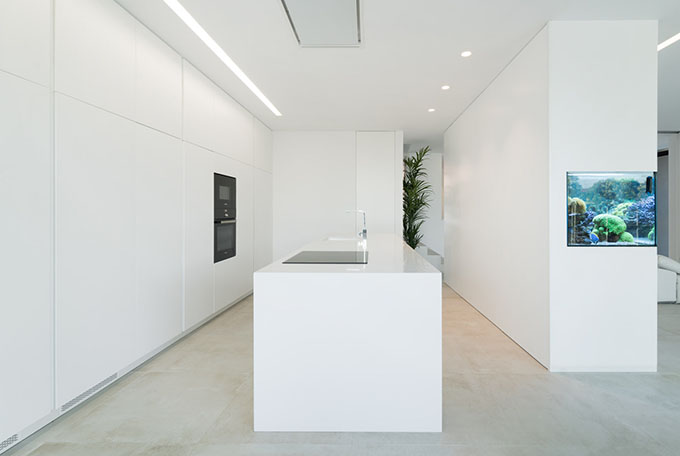 Inside, and in this order; first it was the Aquarium, and then the house came to accompany it. The day area is articulated around a beautiful open aquarium, with tropical waters and a spectacular collection of fish and corals. The rest, open spaces, related between them, without fixed limits, with continuous porcelain flooring, white walls, and indirect lighting.