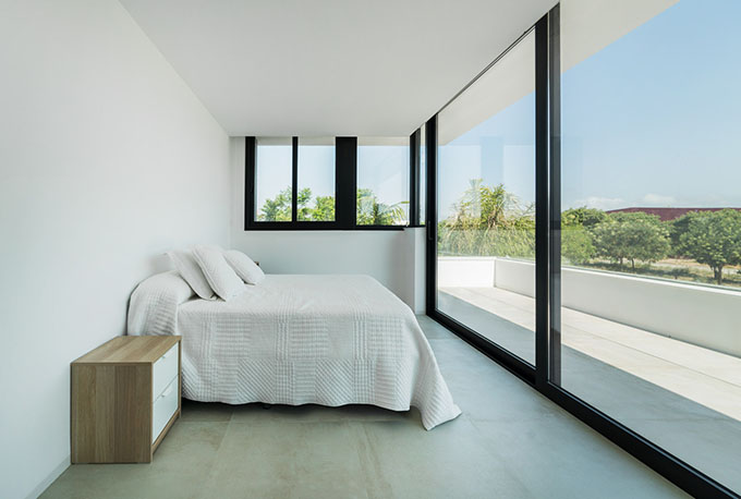 In vertical, all the rooms are closed with large glazing, which allows the appropriation of contiguous exterior spaces and views without limits from each level. The continuity of interior and exterior pavement, and large windows flush with the pavement, facilitate spatial continuity.