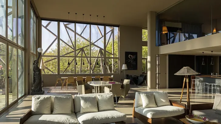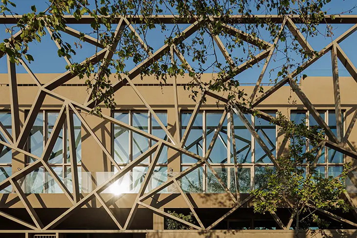 The project introduces a contemporary extension on the western side, marked by a sculptural brise-soleil. This element establishes a distinct identity through its abstract vertical rhythm, referencing the surrounding trees without direct imitation. The contrast between restored and new volumes creates a dialogue that acknowledges time while maintaining cohesion across the block.