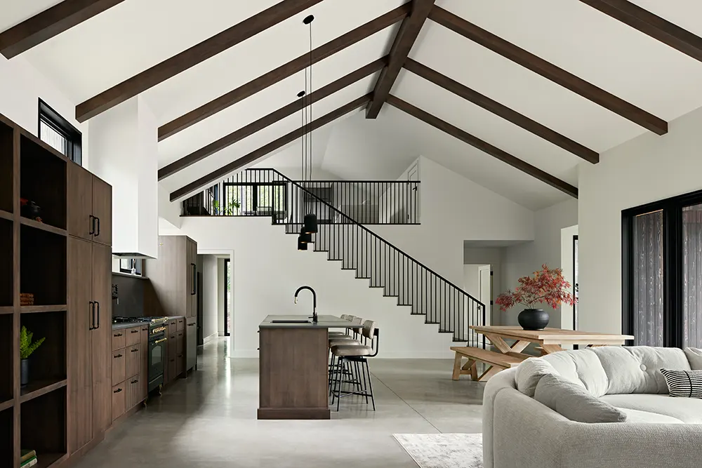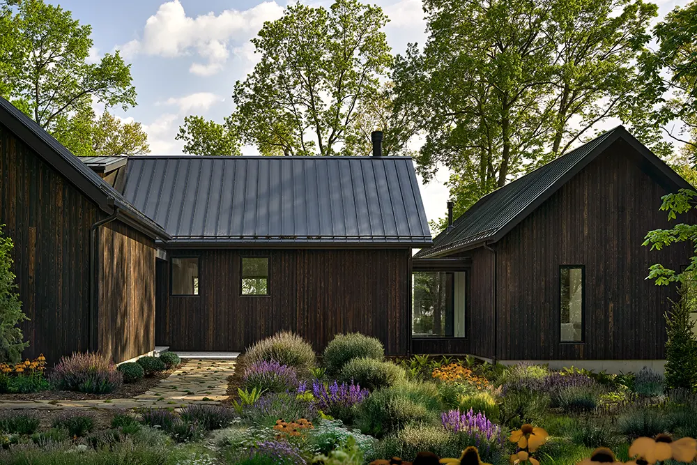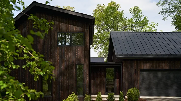 The exterior uses dark shou sugi ban wood, giving the cabins a uniform character that minimizes visual distraction and strengthens a sense of continuity. Inside, oak rafters span tall ceilings and long distances, and these elements stand out against white walls and functional artisan furniture. Concrete floors anchor the interior and connect the home to the sloping glacial site.