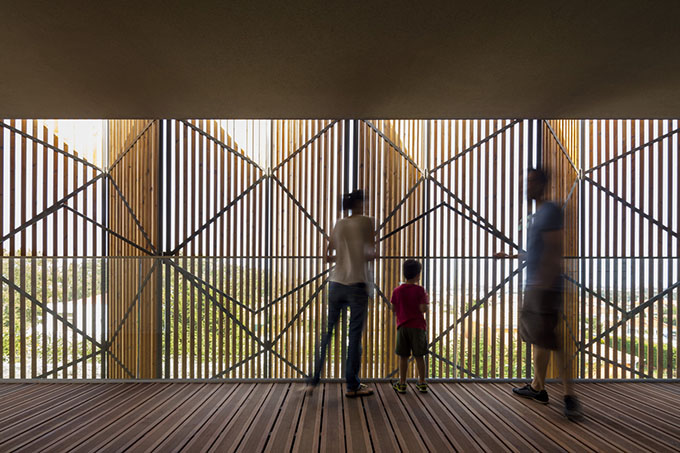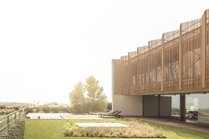 The look lingers on and stretches over the distant landscape. On the upper floor, the rooms are protected from the outside by the expressive wooden brise soleil allowing the desired quietness.