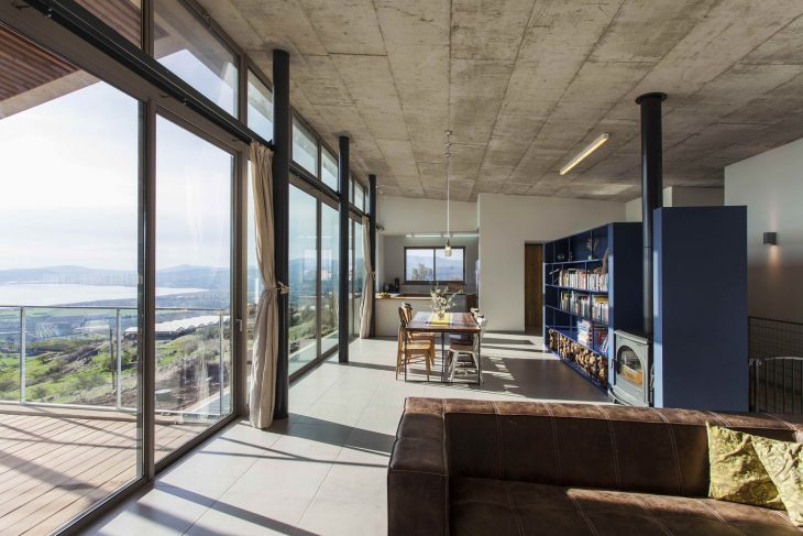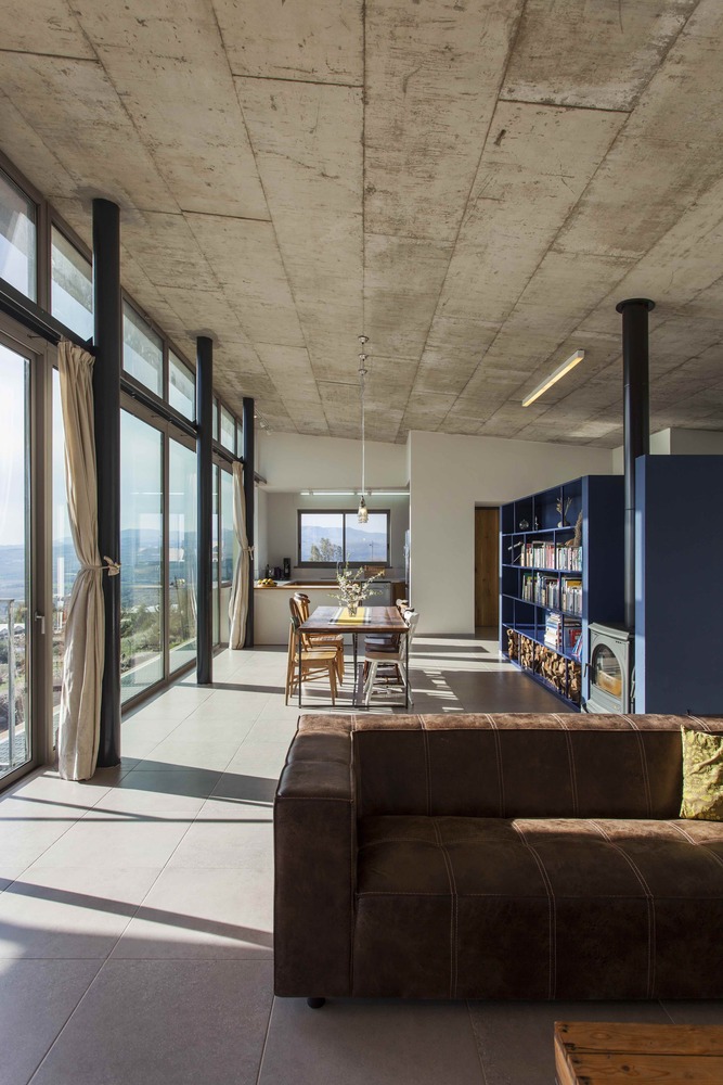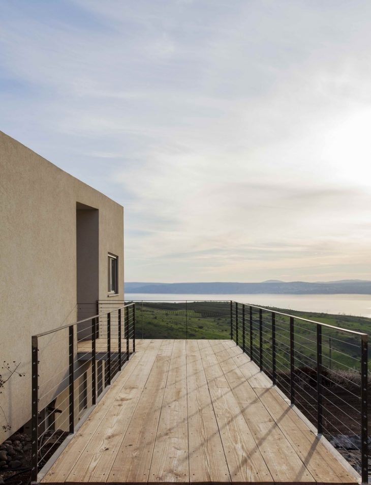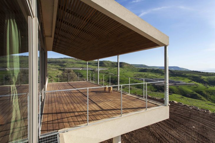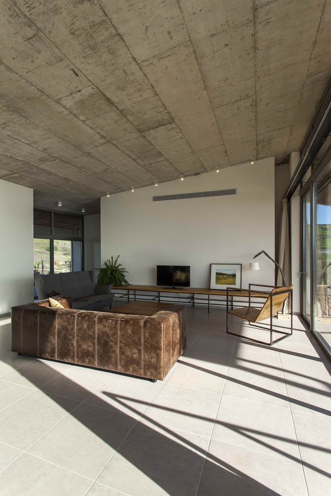 A private residence frames a spectacular natural context, on the hills surrounding the Galilee Sea. Folded in a plastered white envelope, the inner spaces are oriented towards the view and invite it to enter the family’s domain. Reflecting upon the surroundings, a wide usage of roughly finished natural materials has been made. The exposed concrete ceilings emphasize the inclined section and call for the spectator to walk outside, onto the wooden deck. Steel structure articulate a rhythmic façade and compliment the pallette. The owner, a practicing carpenter and locksmith, lovingly made many of the construction and furnishing details himself, such as: the central blue library, the wooden decks and pergola, the TV mezzanine and armchair. The bottom floor is a studio for the owner.